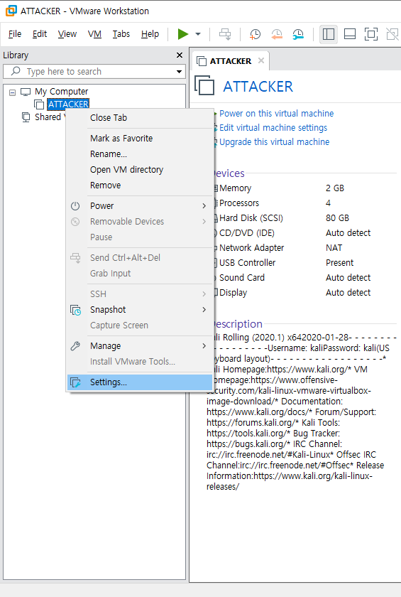 Kali ~~~ 나오는데 클릭을 한 후 F2를 눌러 ATTACKER로 변경한다.