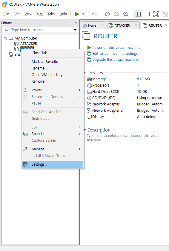 ATTACKER와 연결을 위한 Network Adapter 1개,